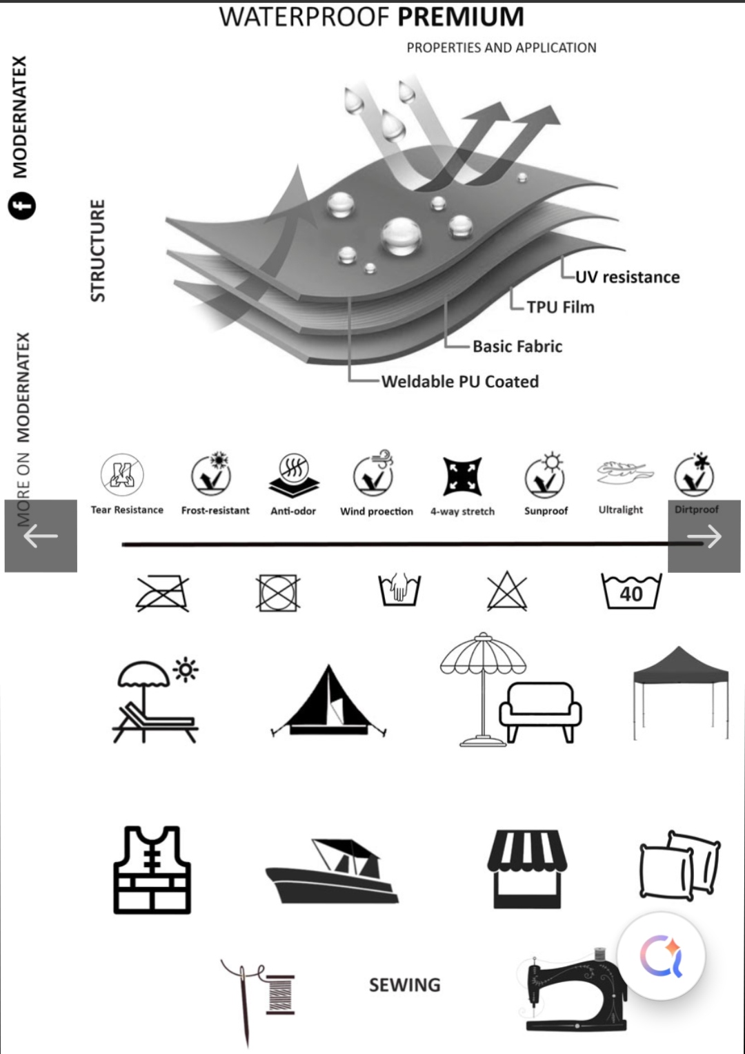Nepromokavá část: Voděodolná látka prémiové kvality s gramáží 190 g/m², odolná, pevná a snadná na údržbu, nečistoty stačí otřít vlhkým hadříkem.
